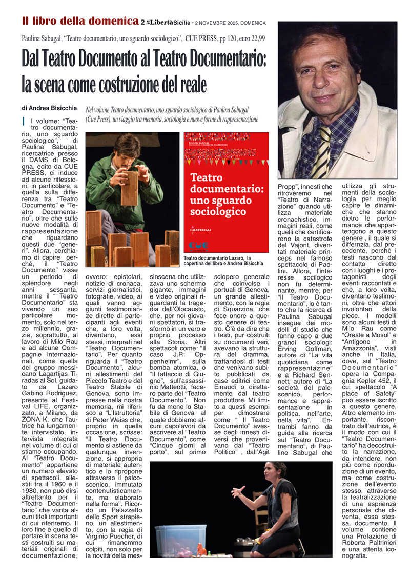Nel volume Teatro documentario, uno sguardo sociologico di Paulina Sabugal (Cue Press), un viaggio tra memoria, sociologia e nuove forme di rappresentazione