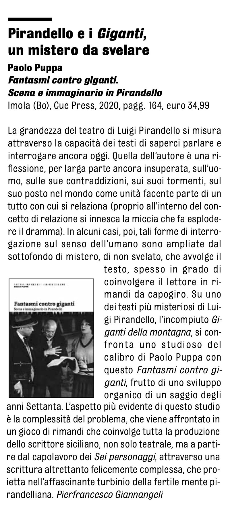 La grandezza del teatro di Luigi Pirandello si misura attraverso la capacità dei testi di saperci parlare e interrogare ancora oggi. Quella dell’autore è una riflessione, per larga parte ancora insuperata, sull’uomo, sulle sue contraddizioni, sui suoi tormenti, sul suo posto nel mondo come unità facente parte di un tutto con cui si relaziona (proprio all’interno del concetto di relazione si innesca la miccia che fa esplodere il dramma). In alcuni casi, poi, tali forme di interrogazione sul senso dell’umano sono ampliate dal sottofondo di mistero, di non svelato, che avvolge il testo, spesso in grado di coinvolgere il lettore in rimandi da capogiro. Su uno dei testi più misteriosi di Luigi Pirandello, l’incompiuto Giganti della montagna, si confronta uno studioso del calibro di Paolo Puppa con questo Fantasmi contro giganti, frutto di uno sviluppo organico di un saggio degli anni Settanta. L’aspetto più evidente di questo studio è la complessità del problema, che viene affrontato in un gioco di rimandi che coinvolge tutta la produzione dello scrittore siciliano, non solo teatrale, ma a partire dal capolavoro dei Sei personaggi, attraverso una scrittura altrettanto felicemente complessa, che proietta nell’affascinante turbinio della fertile mente pirandelliana.